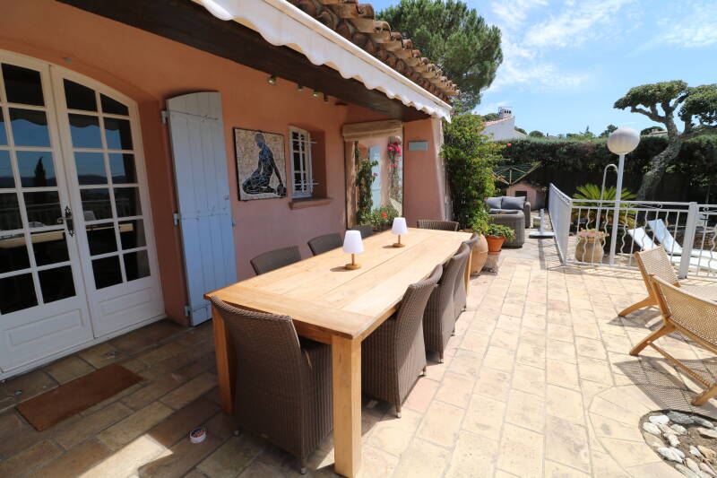 Zuid gericht terras met zicht op zee en het centrum van Sainte-Maxime. Teak tafel met 8 stoelen, zonneluifel, parasol, loungezetel en meerdere bijzetzeteltjes